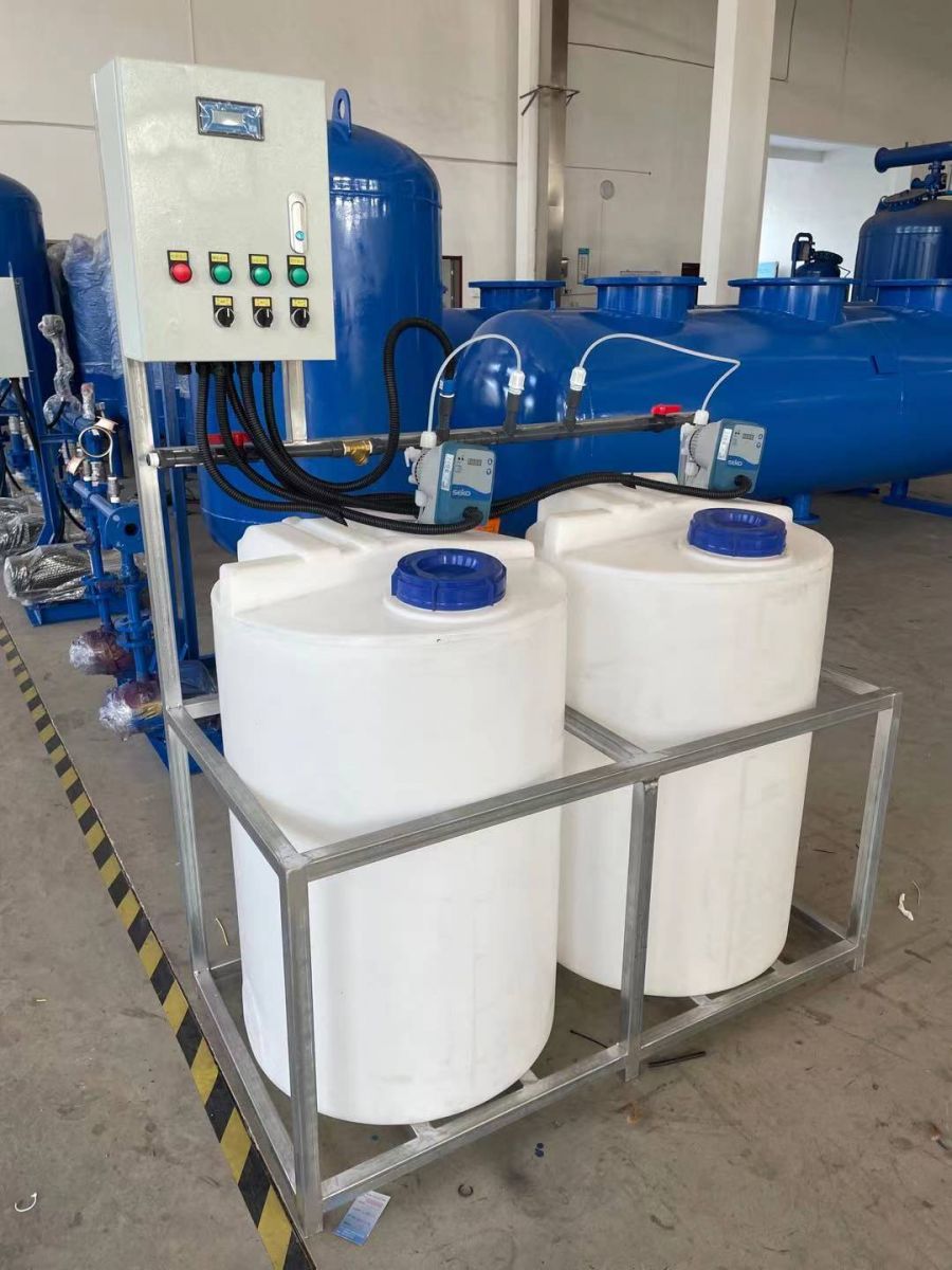 全自動(dòng)加藥裝置采用時(shí)間程序控制,此控制方式無(wú)需儀表的支持,首先根據(jù)系統(tǒng)的運(yùn)轉(zhuǎn)需要設(shè)定自動(dòng)加藥的周期、加藥量、加藥時(shí)間和加藥頻率。在以后的系統(tǒng)運(yùn)轉(zhuǎn)過(guò)程中,到加藥周期,計(jì)量泵自動(dòng)打開(kāi)加藥,加到規(guī)定的時(shí)間計(jì)量泵關(guān)閉;到排污周期,計(jì)量泵停止加藥,排到規(guī)定的時(shí)間后,計(jì)量泵繼續(xù)開(kāi)啟,補(bǔ)充排污損失掉的藥劑,把系統(tǒng)的含藥量維持在正常的水平、加到規(guī)定的時(shí)間計(jì)量泵關(guān)閉。