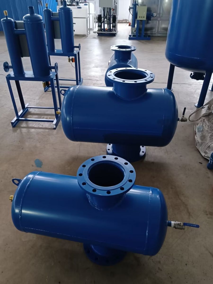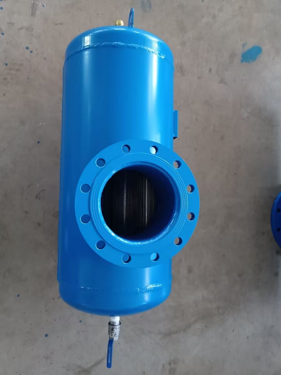 螺旋排氣除污器利用氣水分離、沉降、過濾等機理。當冷卻水、熱水、冷凍水系統(tǒng)中水進入螺旋脫氣過濾器時,體積擴大,流速急劇降低,水中氣泡分離上升至聚氣區(qū),小氣泡吸附在分離板上,當形成大氣泡上升至聚氣區(qū)后通過自動排氣閥排除。