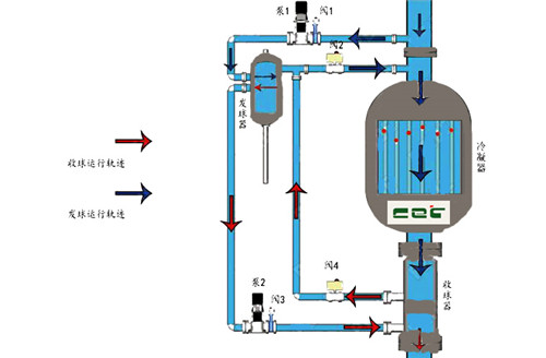 設備采用物理清洗方法,將清洗膠球從發(fā)球器發(fā)送到冷凝器進水端,膠球隨著水流進入每根換熱管,依靠水壓差擦洗換熱管內壁。膠球在冷卻水回水端隨著水流進入收球器內,再將膠球回收至發(fā)球器內,完成一次清洗循環(huán)。