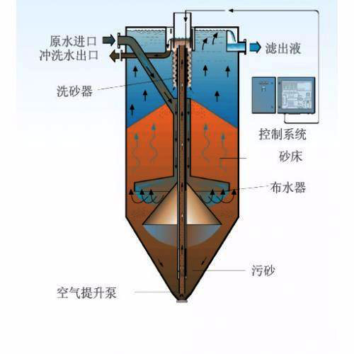 在空壓機的作用下,空氣提升泵將過濾器底層被污染的臟砂提升至過濾器頂部的洗砂器中,通過水流的紊流作用將砂表面的污染物分離出。清洗后的凈砂利用自重返回到砂床中,而清洗砂所產(chǎn)生的污水從過濾器的排污口排出。